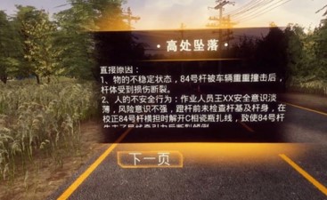 體驗項目包含:應電觸電、桿塔倒塌、基坑中毒、索道墜落、高處墜落傷害、帶電拉(合)接地刀閘、帶負荷合(拉)令克、登高線路行走、電桿倒塌傷害、反供電觸電事故、高空墜落傷害、農電電桿作業VR培訓。