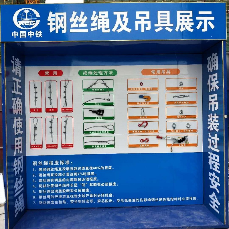 2、采用鍍鋅鋼構架,展示鋼絲繩的正確處理方式和禁用方式。配搭鋼絲繩的一些報廢標準。